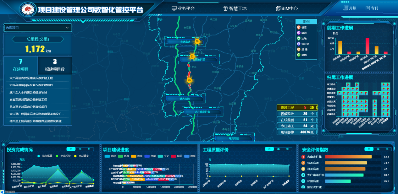 据了解,该项目于2020年12月全面启动研发工作,按照“1+5+N”模式建设,贯穿项目建设全寿命周期数字化管理理念,着力解决了多项目管理、功能模块数据互联互通、统一数据标准的建立等重难点问题。特别是围绕公司“七统一”管理要求,实现了前期、招标、进度、质量、造价、党建、纪检及扫尾等管理功能应用全覆盖。同时,创新数据采集机制,实现了计划、进度、计量、资产自动化功能,提升使用体验。并通过深入研究BIM+GIS、物联网等技术的创新应用和数据交互,基本实现智慧工地平台化管理、BIM+GIS可视化管理。目前,数智化管控平台已在吉康改扩建、梨东改扩建等项目投入使用,成效明显,成为公司、项目办和参建单位分级管控的重要抓手,并将在后续高速公路新建项目全面推广使用。