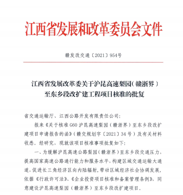 近日,省发改委正式批复同意建设G60沪昆高速梨园(赣浙界)至东乡段改扩建工程。