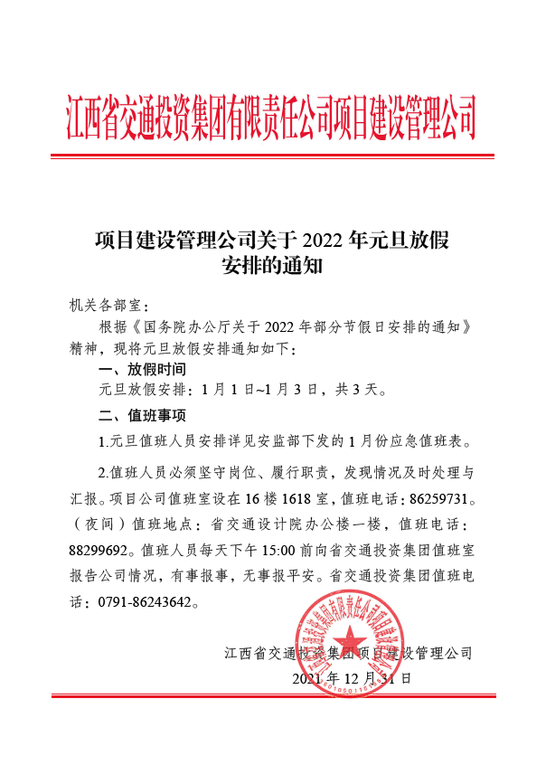 项目建设管理公司关于2022年元旦放假安排的通知