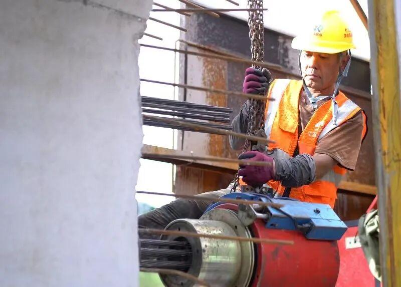 此外,项目办自主研发改进的负弯矩张拉专用操作台车,具备自动升降及180°旋转功能——通过集成吊钩与可360°自由旋转的C型托架,操作人员可轻松、精准地将千斤顶套入钢绞线并与工作锚具精准对接,大幅降低了设备定位难度与劳动强度,施工效率提升近50%。这套设备不仅改善了狭窄空间作业条件,更降低了人工作业安全风险与现场监管难度,成为项目“降本、提质、增效”的又一“利器”。